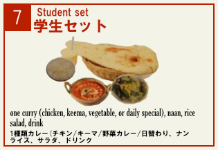 1種類カレー(チキン/キーマ/野菜カレー/日替わり)/ナン/ライス/サラダ/ドリンク
